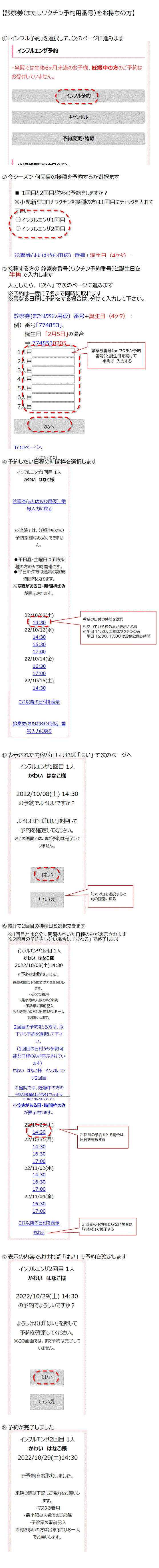 予約には以下の番号が必要です。 ※インフル接種のみで来院したことがある方 → ワクチン予約用番号 ※診察にかかったことのある方 → 診察券番号